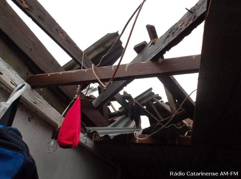 No início da tarde desta terça-feira (2) a chuva acompanhada de vento trouxe prejuízos em algumas residências do bairro São Jorge, Herval d´Oeste. Entre as casas atingidas estava a do senhor Odair José Rodrigues, localizada na rua Heitor Marchiott. “Tudo foi muito rápido. Estava com o meu filho em casa quando começou a chover fraco e foi aumentando. De repente vi minha casa sendo destelhada, principalmente o banheiro”, explicou Odair.