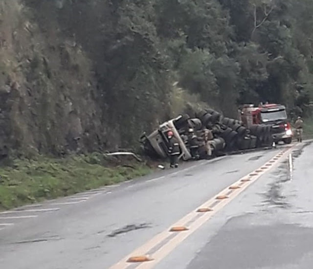 Uma carreta carregada com fertilizantes tombou na manhã deste sábado (27) na Curva do Passat, BR-282, em Herval d´Oeste. O acidente mobilizou o Corpo de Bombeiros por volta das 8h30min.