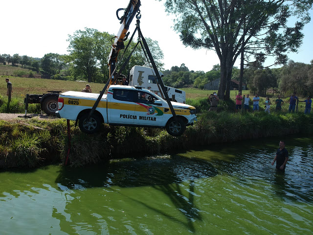 Uma viatura da Polícia Militar Rodoviária (PMRv) caiu em uma açude, no interior de Descanso, no Oeste catarinense, após uma perseguição policial. O fato aconteceu na madrugada desta quinta-feira (22). Os agentes realizavam fiscalização na SC-163, entre Descanso e São Miguel do Oeste.